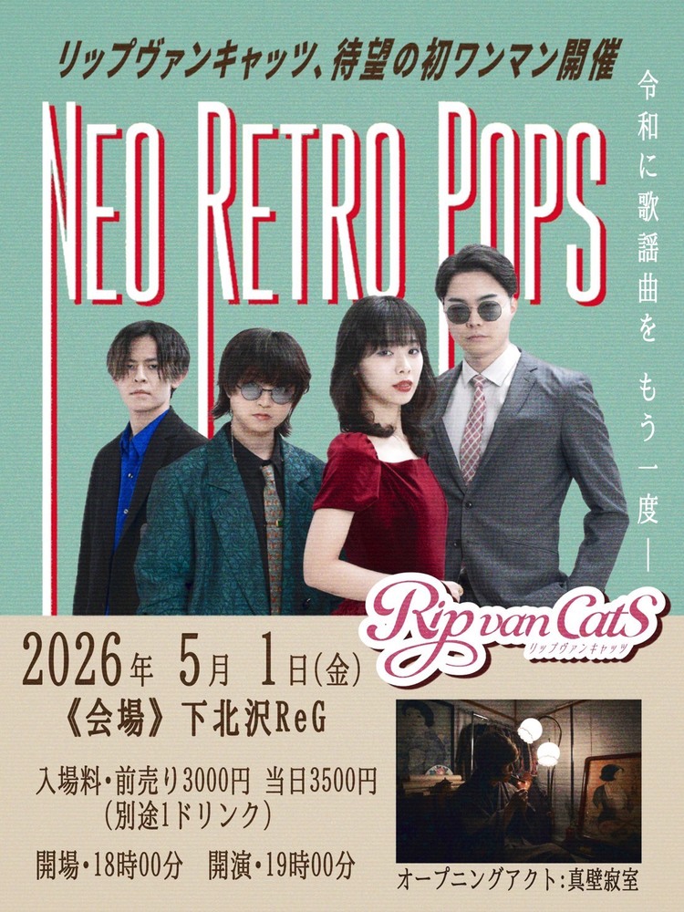 Rip van cats「Neo Retro Pops」オープニングアクト 日程表 2026/05/01(金) 19:00 - 下北沢ReG 地図を表示 Rip van catsさんの初ワンマンライブ「Neo Retro Pops」にてオープニングアクトとして出演致します。 TIGET URLをコピーする 報告する